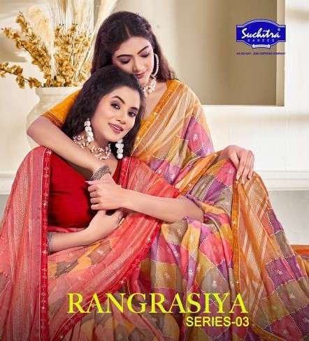 Suchitra Rangrasiya 03 Saree is one of the best from our collection. This saree will combine traditional craftsmanship with modern elegance and include intricate patterns, vibrant hues, and luxurious fabrics. Suchitra Rangrasiya 03 Saree is ideal for someone who wants to make a bold yet elegant statement at weddings, festivals, or any special occasion. Its intricate design and eye-catching colors will surely captivate attention and make the wearer stand out.